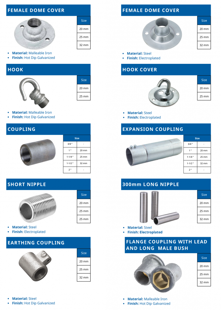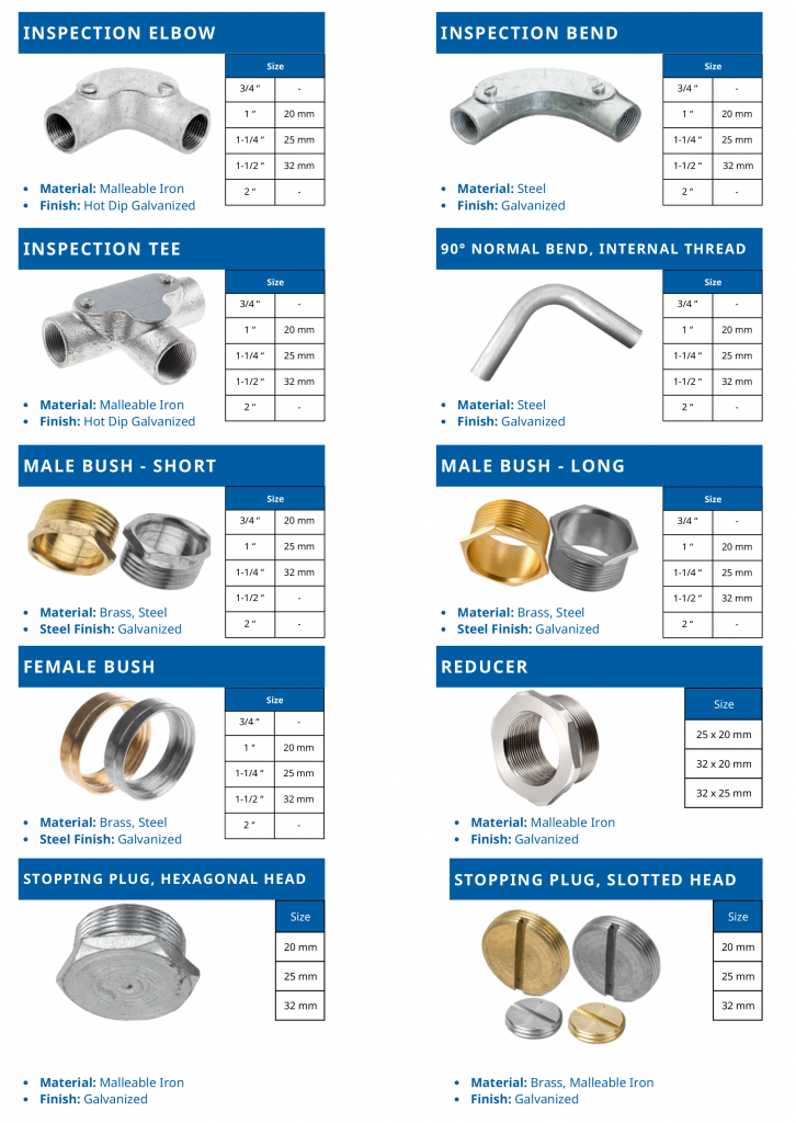 Welcome to our comprehensive product portfolio, where precision engineering meets uncompromising quality. Our extensive range of brass and steel conduits and fittings represents the pinnacle of electrical infrastructure solutions, engineered to excel in the most demanding environments. From our signature rigid steel conduits, crafted with advanced galvanization techniques, to our versatile flexible conduit systems designed for complex installations, each product embodies our commitment to excellence.