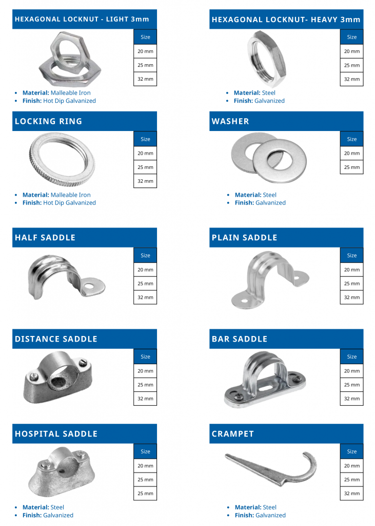 - Heavy corrosion protection by Hot-Dip Galvanizing on the exterior and interior surface of the conduit.